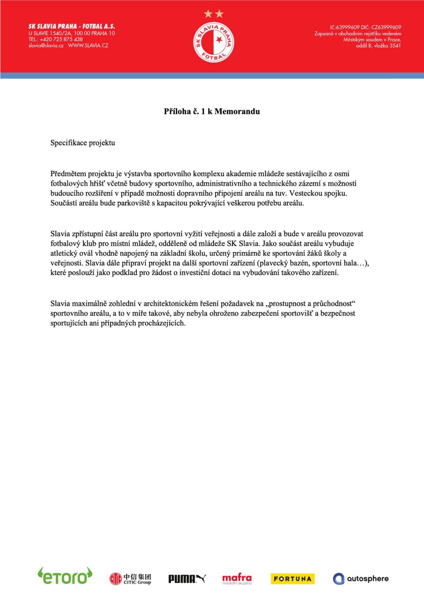 12/ Slavia se v dokumentaci, kterou šeberovští zastupitelé prostudovali, zavazuje například k tomu, že její centrum bude pomáhat ve vzdělávání. Je to někde písemně uvedeno?